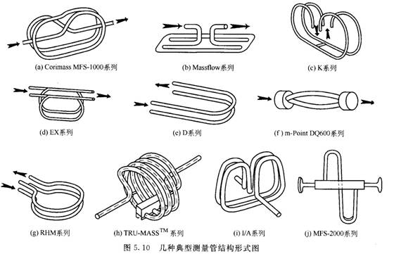 測量管從結構形狀來分,有彎管式和直管式兩大類。目前大多數(shù)產品為彎管式,其形狀有U形、運動跑道形、B形、S形、 Ω 形、雙梯形、螺旋形、 Δ形等。不管什么形狀,又有單管、雙管(雙環(huán))、多管(多環(huán))幾種。其中,大多數(shù)產品是采用兩根平行的管子,而多管(多環(huán))式,其用于測量的部分也是兩根管(環(huán))。從結構上看,雙管結構目前大多數(shù)采用并聯(lián)式,在入口處有分流器,把來自法蘭接口的流量對稱地分成兩部分流入兩根測量管,在出口處又有一個匯流器,將兩根管中流體重新匯集在一起通過出口法蘭送出。這樣的結構要求分流器完全對稱,兩根支管也必須對稱,出廠前要嚴格調試好動態(tài)平衡。另一種是采用單管串聯(lián)雙環(huán)的型式,用于測量的支管看起來仍是兩根(雙環(huán)),由于它是用一根管子串聯(lián)組成的,入口和出口沒有分流器和匯流器,因分流而造成的不對稱的缺點得到了克服,圖5.7所示的CORIMASS MFS-1000就是單管串聯(lián)雙環(huán)結構。大多數(shù)雙管并聯(lián)式產品在其精確度規(guī)定中有" ± 零點穩(wěn)定性"一項(數(shù)值有指標控制)。而單管雙環(huán)式,因其零點穩(wěn)定性好,在精確度指標中沒有"零點穩(wěn)定性"這一項。U形測量管的改進型 Δ形測量管較U形靈敏度性能均有提高。單管直管型質量流量計目前已具有一定的市場占有率,與傳統(tǒng)的雙管型結構相比有很大的優(yōu)越性,如流通能力大、壓損更小、更易清洗等。單管直管形結構在設計上要很好解決抗振性問題。Promass M型流量計(圖5.9)是該種類型產品之一。毫無疑問,單管直管型式是今后質量流量計的發(fā)展趨勢和方向。圖5.10列舉了幾種典型的測量管的結構形式。