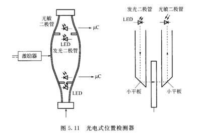 位置檢測器多數(shù)采用電磁式的,把線圈固定在一根管子上,磁鐵固定在另一根管子上,一般以驅動器為中心,左右對稱各安裝一只,兩根支管的振動扭曲程度直接反映在位置檢測器中,信號送至轉換電路加以處理。還有一種光電式檢測器,在測量管兩端各有一對小平板焊在兩根測量管上,之間有一定間隙,間隙(快門)寬度依兩根測量管扭曲程度而變化,由發(fā)光二極管發(fā)射的紅外光線經藍寶石傳導系統(tǒng)通過快門間隙在另一側被高靈敏度光敏二極管接收,并轉換成交流電信號。如圖5.11所示。