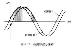 來自傳感器的信號在輸入級轉變?yōu)閿?shù)字量,并在每個周期內密集采樣(如圖5.13所示),輸送至第一個微處理器,把兩個檢測器(A、B)測得的時間差換算成為科氏力位移之差,從而給出與質量流量成正比的信號。這種數(shù)字信號處理電路的特點如下。