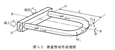 以U形測量管為例,如圖5.2所示,在外力的驅動下,U形測量管繞O-O軸按其自然頻率ω振動。當流體以勻速流過U形管時,根據(jù)質點動力學原理,在U形管向上運動時,入口一側產生向上的科氏加速度,相應的科氏力F1向下作用在管壁上;出口一側產生向下的科氏加速度,相應的科氏力F2向上作用在管壁上。Fl與F2大小相等,方向相反(F1=F2 =Fc)。
