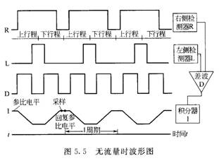 圖5.5和圖5.6所示分別為通過邏輯電路處理過的無流量時和有流量時的波形圖。從傳感器管的端部看過去,有左、右兩根支管,流量分別從其中流入和流出,電磁位置檢測器檢測其矩形頻率波。左、右信號交替產生,右面檢測器信號采用寬波形(R),而左面的信號采用窄波形,這樣就避免了信號的重疊。