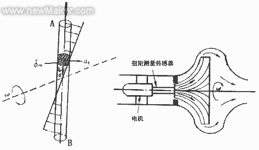 早期設(shè)計(jì)的科氏力質(zhì)量流量計(jì)的結(jié)構(gòu)如圖2所示。將在由活動(dòng)流體的管道送進(jìn)一旋轉(zhuǎn)系統(tǒng)中,由安裝在轉(zhuǎn)軸上的扭矩傳感器,來完成質(zhì)量流量的丈量。這種流量計(jì)只是在試驗(yàn)室中進(jìn)行了試制。