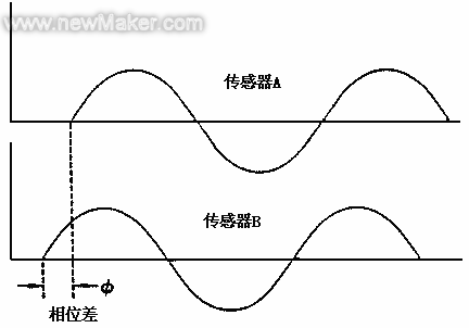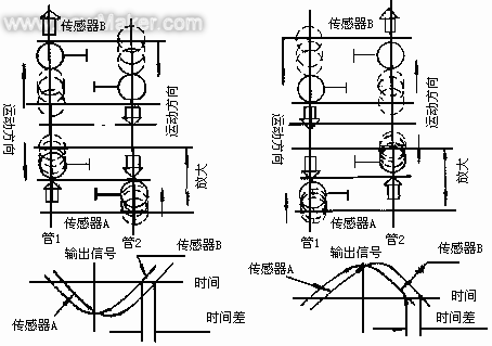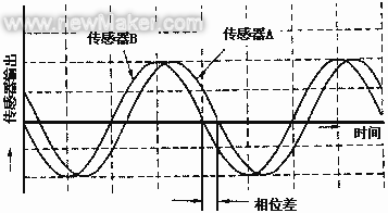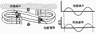 隨著振蕩運(yùn)動(dòng)的進(jìn)行,丈量管被周期性地分開、靠攏,科氏力也周期性地作用在兩根丈量管上,通過安裝在丈量管上的位移創(chuàng)按其A、B,測出由科氏力引起的丈量管相對(duì)位置的變化,通常轉(zhuǎn)化為測兩點(diǎn)的相位差,如圖7所示。這個(gè)相位差的大小與質(zhì)量流量成正比。