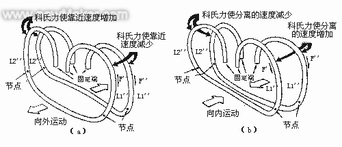 而回路中的流體在科氏力作用下示的回路L1'和L1''相互靠近的速度減慢,而另一端L2'和L2''兩回路相互靠近速度增加。