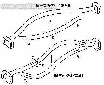 其工作原理簡述如下:當(dāng)測管中流體不活動(dòng)時(shí),振動(dòng)力使管子產(chǎn)生的變形,在中間點(diǎn)兩邊是一樣的,傳感器處的兩測點(diǎn)上,測得的振動(dòng)位移的相位差為零,當(dāng)測管中流體活動(dòng)時(shí),在振幅最大點(diǎn)之前,流體質(zhì)點(diǎn)由于受到科氏力的作用產(chǎn)生一個(gè)與振動(dòng)方向相反的作用力,而在這點(diǎn)之后產(chǎn)生一個(gè)與振動(dòng)方向相同的作用力,由于在同一時(shí)刻兩根丈量管所受到的作用力大小相等,方向相反,因此反映在兩傳感器處測點(diǎn)上管子的運(yùn)動(dòng)速度得到增大或減小,丈量這兩點(diǎn)的相位差就可得到通過丈量管流體的質(zhì)量流量。