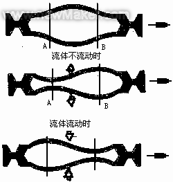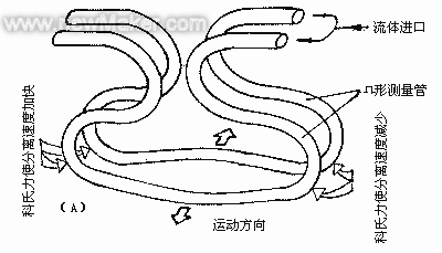 如圖23a,當(dāng)管子分開時(shí),在振點(diǎn)前的流體中產(chǎn)生的科里奧利力與振動(dòng)力方向相反,減慢管子的運(yùn)動(dòng)速度;而在振點(diǎn)之后管中流體產(chǎn)生的科氏力與振動(dòng)方向相同,加快管子的運(yùn)動(dòng)速度。當(dāng)驅(qū)動(dòng)器使管子靠近時(shí),如圖23b,則產(chǎn)生相反的結(jié)果。在A、B兩點(diǎn)的傳感器可測的兩處管字運(yùn)動(dòng)的相位差,由此可得到流過測管中流體的質(zhì)量流量。