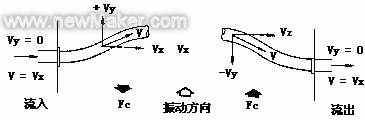 當(dāng)丈量管中流體不活動(dòng)時(shí),兩根丈量管在驅(qū)動(dòng)力作用下(作用在每根管子上的力大小相等、方向相反)作對(duì)稱的等振幅運(yùn)動(dòng)。由于管子兩端是固定的,在管子中間振幅最大,到兩端逐漸減為零。這時(shí)在兩個(gè)傳感器上測得的相位如圖4B所示,由圖中可以看出,兩傳感器測得的相位差為零。當(dāng)丈量管內(nèi)流體以速度V活動(dòng)時(shí),流體中任意值點(diǎn)的流速,可以為是兩個(gè)分流速的合成:水平方向Vx及垂直方向Vy(與振動(dòng)方向相同)。在恒定流條件下,流體沿水平方向的流速Vx保持恒定。從圖5中可以看出,管子的進(jìn)、出口處振幅為零,流體質(zhì)點(diǎn)垂直移動(dòng)速度Vx為零;