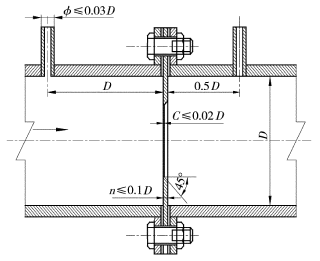 在管道里插入1個與管軸垂直的金屬板,金屬板中心為1個圓孔,孔的中心位于管道的中心線上,孔板稱為節流元件。在孔板進氣側距離孔板1個管道直徑的位置,安裝1個測壓管;在孔板出氣側距離孔板半個直徑的位置,安裝1個測壓管。通過測壓管測出管道內氣體的2個壓力,2個壓力之差代入公式就可以計算出流量。如圖1。
