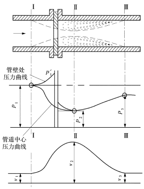 流體在管道截面I-I以前,以一定的速度流動,管內靜壓力為p1。由于節流元件的孔徑小于管道內徑,當流體流經節流元件時,流體截面突然收縮,流速加快,靜壓降低。當流體流過圓孔以后,由于慣性作用,流體截面繼續收縮一定距離,到流體截面最小處,流體截面最小處(圖2中Ⅱ-Ⅱ)稱為縮脈,流體在縮脈處的流速最高,動能最大,靜壓最低。流體流過縮脈后,流體截面開始逐漸擴大,到管道截面Ⅲ-Ⅲ處,流體截面恢復到整個管道截面。