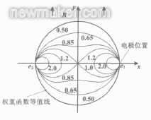 在生產(chǎn)過程中,最難處理的是另外一種波動。該波動周期很慢,但幅度很大,大到足以引起跳車。要把這種現(xiàn)象解釋清楚,就需要引進權(quán)重函數(shù)的概念[3-6]。粗略地說,權(quán)重函數(shù)給出了不同位置的流體切割磁力線所產(chǎn)生的感應(yīng)電動勢對電極信號的貢獻率。權(quán)重函數(shù)示意圖如圖2所示。