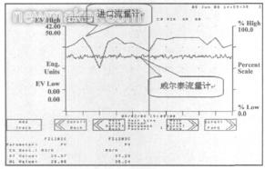 本文所提的解決方案先后成功應(yīng)用于國內(nèi)兩家煤化工企業(yè)。首先,該方案被應(yīng)用于波動相對頻繁的豎管,橫管仍然采用原來的進口流量計。某企業(yè)因原進口流量計波動頻繁而引發(fā)跳車事故一年多達幾十次。由于威爾泰所提供的煤漿流量計平穩(wěn)性遠優(yōu)于其他同類產(chǎn)品,自投運以來,該企業(yè)從未因流量計波動而引起誤跳車。圖5所示為監(jiān)控系統(tǒng)工作站屏幕截圖所得的流量輸出平穩(wěn)性對比圖。由圖5可以看出,當(dāng)位于橫管的進口流量計出現(xiàn)大幅度波動時,豎管威爾泰流量計輸出仍然保持平穩(wěn)。同時,工藝人員利用爐溫等其他參數(shù)進行綜合判斷,同樣證明了該豎管流量計輸出的穩(wěn)定性。