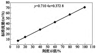 按玻璃管上的百分比刻度做其對應的標準流量,如表3所示。從表3可看出,假如需要60m3/h、50m3/h、40m3/h、30m3/h的標準流量時,我們是無法較為準確把浮子調到玻璃管上其對應的位置的,因此需要通過下列步驟得到我們想要的結果。