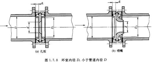 表1.7.5所示為節流件前后裝設異徑管。由表可見,在節流件前裝設漸擴管會引起很大的測量誤差,而在節流件前后裝設漸縮管,只要漸縮管夾角不大,流出系數的偏離可小于2%。