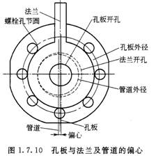 圖1.7.10所示為節流開孔軸線與法蘭內圓軸線及管道軸線之間的偏心圖形。偏心率對流出系數的影響與B值、取壓方式、偏心方向等有關,如圖1.7.11所示。 自