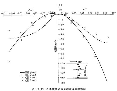 圖1.7.13所示為孔板撓曲對流量測量誤差的影響。造成孔板撓曲的原因可能有制造質量差,安裝產生應力或大差壓造成的等等。