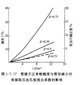 文丘里管內壁沉積臟物起二重作用:減少通道截面積和增加表面粗糙度。兩種影響綜合起來使流出系數降低,如圖1.7.16所示。