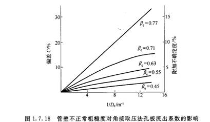 1.角接取壓標準孔板在糙管中流出系數的變化圖1.7.17和圖1.7.18所示為角接取壓標準孔板在糙管中流出系數的變化。圖1.7.17所示管壁條件為:管壁結垢為球形瘤,平均尺寸為6.3mm,亦就是管道內徑有效值減少約6.3mm。 因中虛線B=0.71是經砂磨表面,顆粒約O.5~1.Omm。圖1.7.18所示的管壁條件顆粒尺寸約1mm多,即約為圖1.7.17所示的1/3。