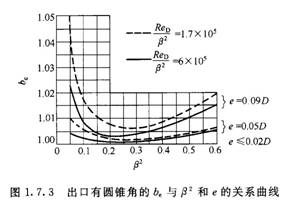 孔板開孔圓筒形部分長度e不論其出口是否有圃錐角,均應小于或等于0.02D.對角接取壓標準孔板,當e>0.02D時,應進行修正,其修正系數為be.be與ReD無關,僅與e和B2有關。但是,出口有圓錐角的孔板和無圓錐角的孔板,其be值是不同的,如圖1.7.2和圖1.7.3所示。這兩張圖可采用線性內插,但不得外推。