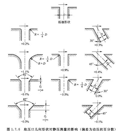 取壓口有毛刺或沉積污物會引起誤差,特別在流速較高處,如噴嘴和文丘里管的喉部,將引起很大的誤差,角接取壓口在流動的滯止區,因此影響稍小些。取壓口幾何形狀對靜壓測量的影響如圖1.7.6所示。其偏差為動壓的百分數。