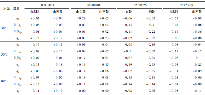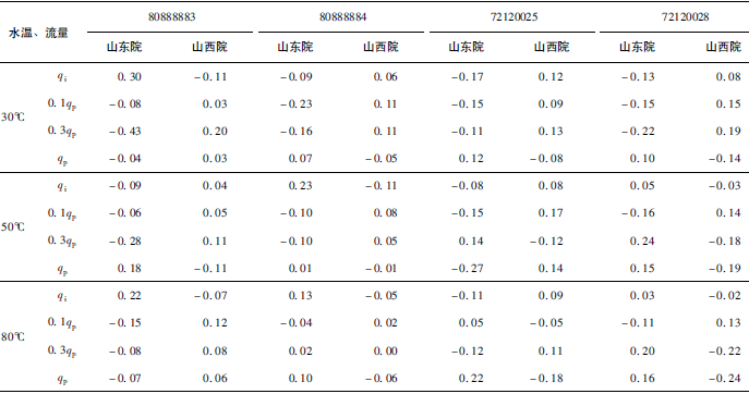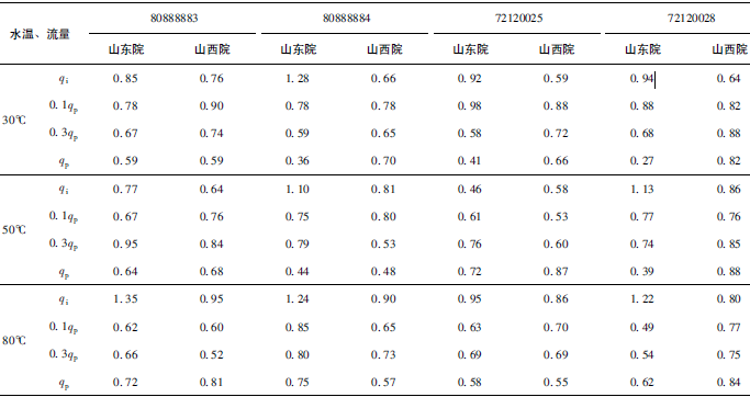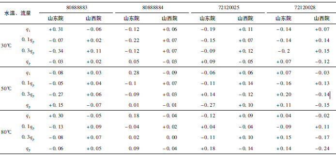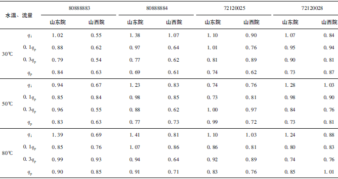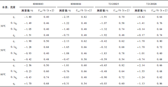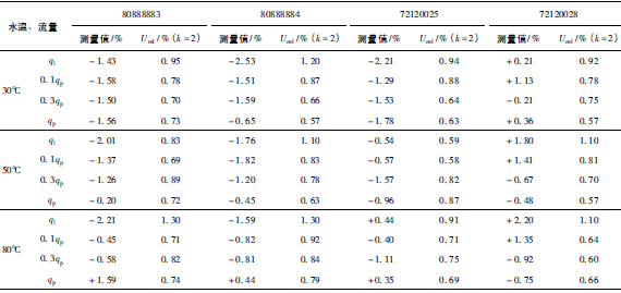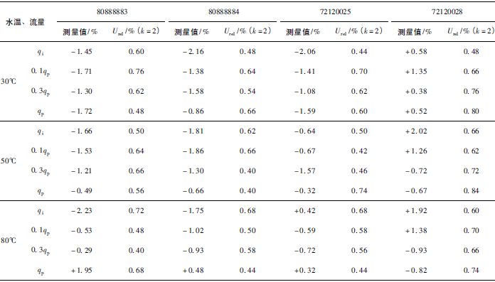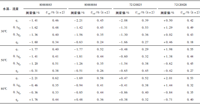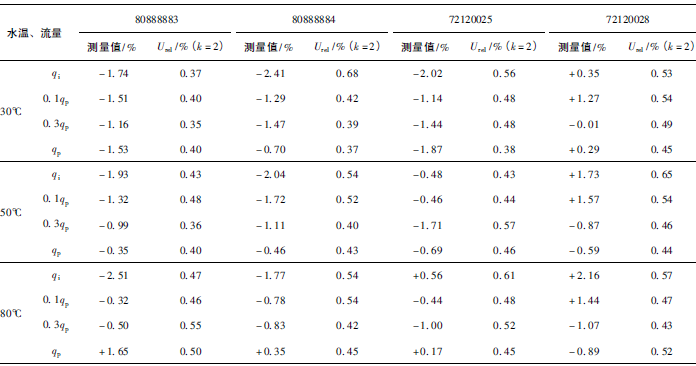 (3)累積體積(標準表法)相對示值誤差測量結(jié)果中,山東院在水溫30℃、qi點處與參考值的差值最大,為+0.31%(80888883);山西院在水溫80℃、qp點處與參考值的差值最大,為-0.24%(72120028)。同樣在標準表法中比對樣品在一些試驗點上的測量重復性也不是很好,差值的擴展不確定度最大達到了1.41%。