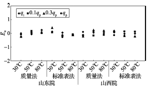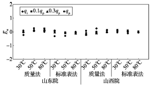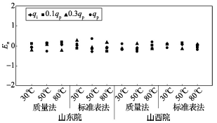 (2)累積體積(質(zhì)量法)相對示值誤差測量結(jié)果中,山東院在水溫80℃、qi點處與參考值的差值最大,為+0.31%(72120025);山西院在水溫30℃、0.3qp點處與參考值的差值最大,為+0.36%(72120028)。由于比對樣品在一些試驗點上的測量重復性不是很好,差值的擴展不確定度最大達到了1.35%。