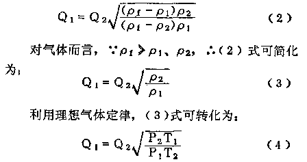如果兩種不同密度ρ1、ρ2的介質(zhì)分別通過同臺轉(zhuǎn)子流量計時,若浮子平衡在同一位固上,由(1)式得轉(zhuǎn)子流量計密度換算的基本式:
