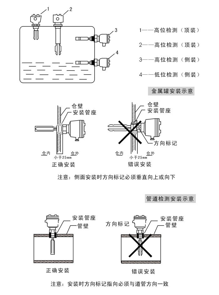 音叉式物位開(kāi)關(guān)通常采用側(cè)裝(在倉(cāng)壁側(cè)面安裝)方式安裝與倉(cāng)體側(cè)壁對(duì)料位高度進(jìn)行上下限位置的檢測(cè);當(dāng)倉(cāng)體不便側(cè)面開(kāi)孔時(shí)可采用頂裝(在倉(cāng)的頂部安裝)方式安裝,位置應(yīng)選擇能避開(kāi)進(jìn)料時(shí)物料沖擊的位置;亦可安裝與管道上防止泵的無(wú)料運(yùn)行。