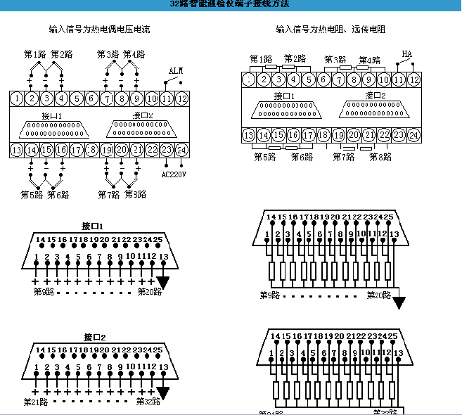 報警輸出: ⑴1-64通道統一上下限報警,繼電器輸出觸點容量 AC220V/3A